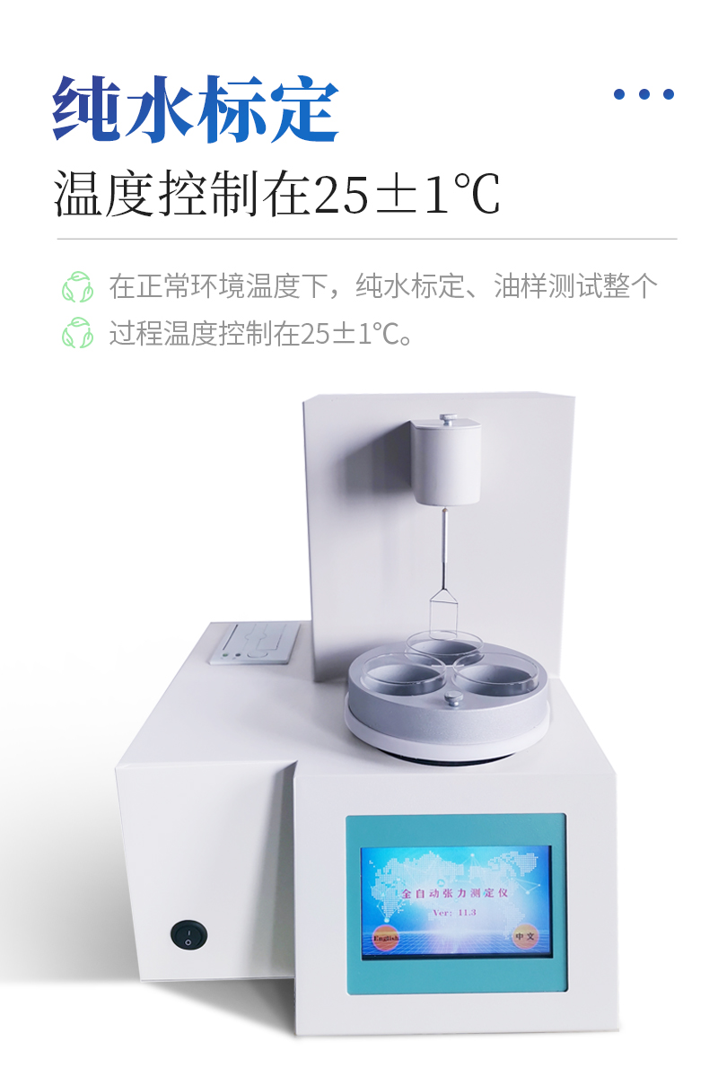 儀器特點(diǎn)★ 在正常環(huán)境溫度下,純水標(biāo)定、油樣測(cè)試整個(gè)過程溫度控制在25±1℃。★ 溫度控制采用PID自整定技術(shù)★ 樣品分析效率高,可同時(shí)放三個(gè)樣品★ 使用不同測(cè)量環(huán)儀器自動(dòng)修正參數(shù)★ 自動(dòng)打印試驗(yàn)結(jié)果,動(dòng)態(tài)張力曲線顯示★儀器采用等一點(diǎn)標(biāo)定,簡(jiǎn)單方便,保證測(cè)量精度;★高清晰彩色觸摸