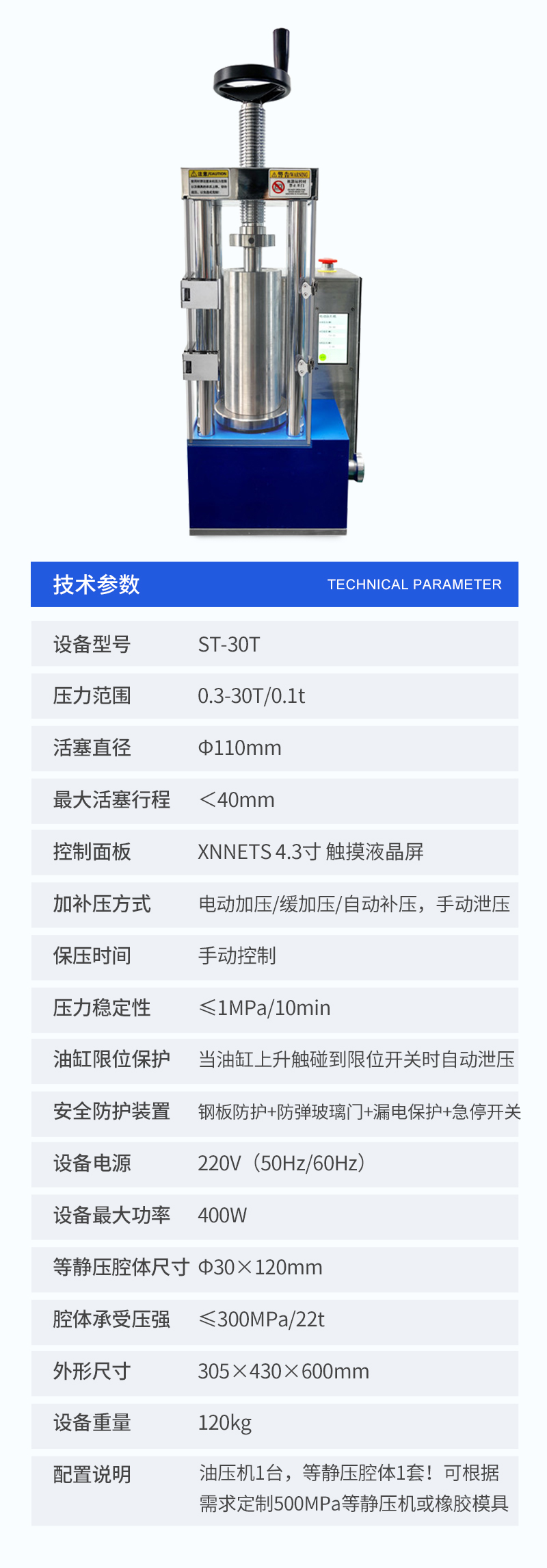 | 配置說明 | 油壓機1臺,等靜壓腔體1套!可根據需求定制500MPa等靜壓機或橡膠模具 |