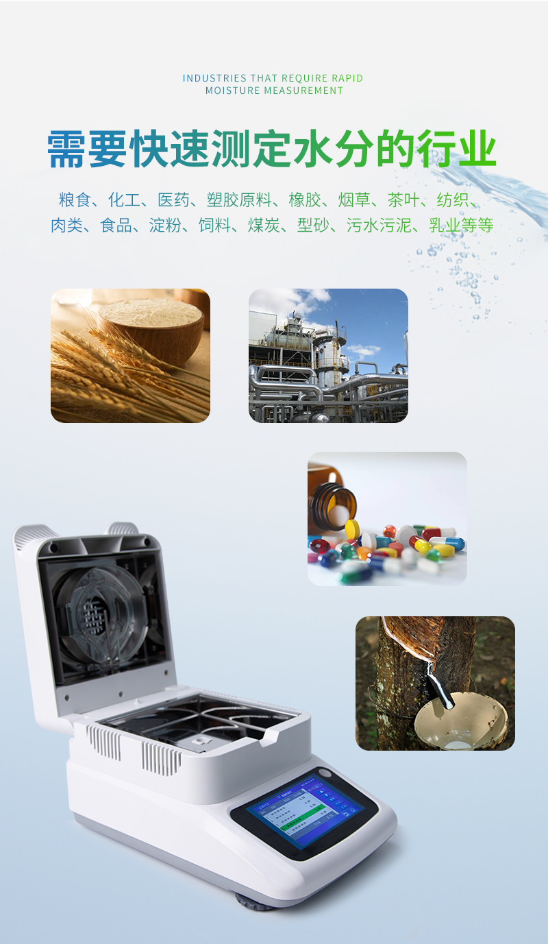 該系列快速水分測定儀應用于一切需要快速測定水分的行業,只要是顆粒狀、粉末狀、片狀物、無揮發性液體均可測量,如:糧食、化工、醫藥、塑膠原料、橡膠、煙草、茶葉、紡織、肉類、食品、淀粉、飼料、煤炭、型砂、污水污泥、乳業等等;