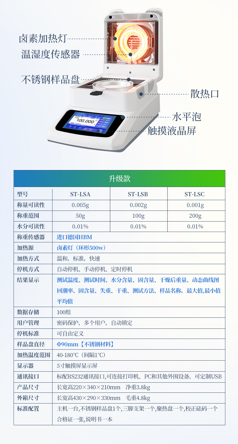 該系列快速水分測定儀應用了國際烘箱干燥法原理,測定結果與烘箱法水分測定具有良好的一致性,工作效率卻遠遠高于烘箱法水分測定,一般樣品只需要幾分鐘即可測量完畢,因此受到廣大用戶的青睞與好評。