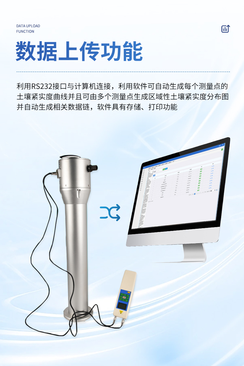 具有數(shù)據(jù)上傳功能:利用RS232接口與計(jì)算機(jī)連接,利用軟件可自動(dòng)生成每個(gè)測(cè)量點(diǎn)的土壤緊實(shí)度曲線并且可由多個(gè)測(cè)量點(diǎn)生成區(qū)域性土壤緊實(shí)度分布圖并自動(dòng)生成相關(guān)數(shù)據(jù)鏈。軟件具有存儲(chǔ)、打印功能。