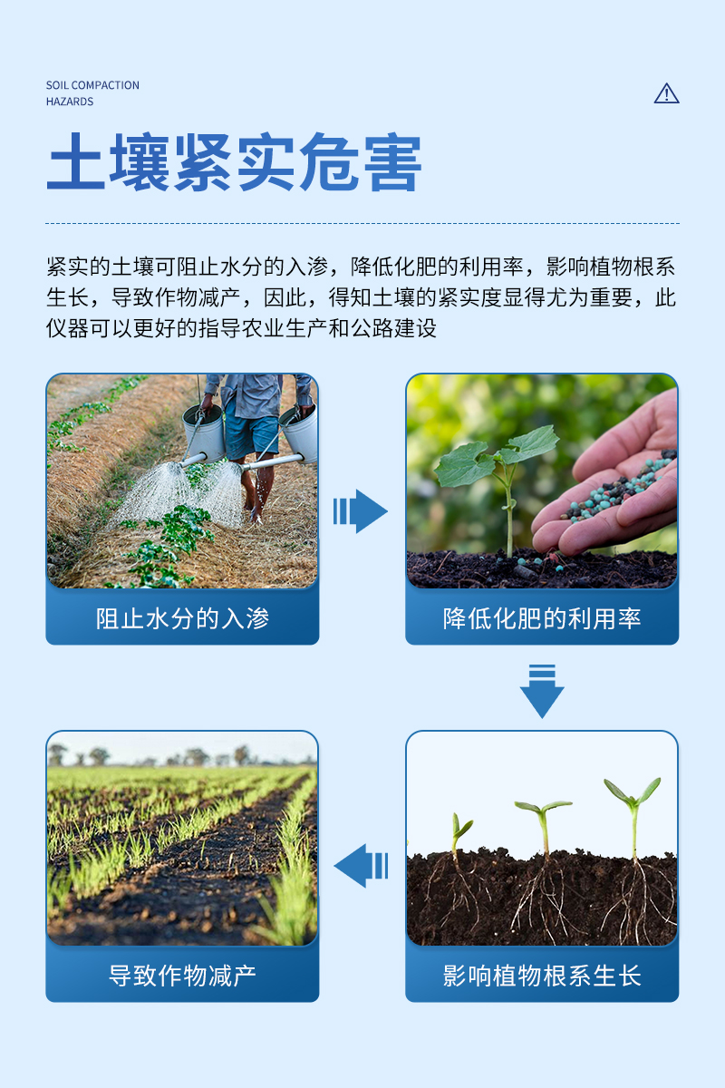 緊實(shí)的土壤可阻止水分的入滲,降低化肥的利用率,影響植物根系生長(zhǎng),導(dǎo)致作物減產(chǎn)。因此,得知土壤的緊實(shí)度顯得尤為重要,此儀器可以更好的指導(dǎo)農(nóng)業(yè)生產(chǎn)和公路建設(shè)。